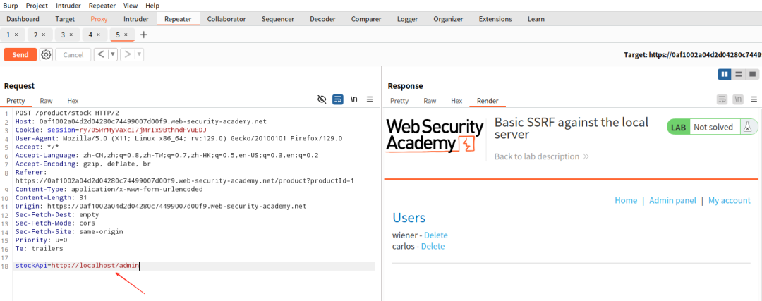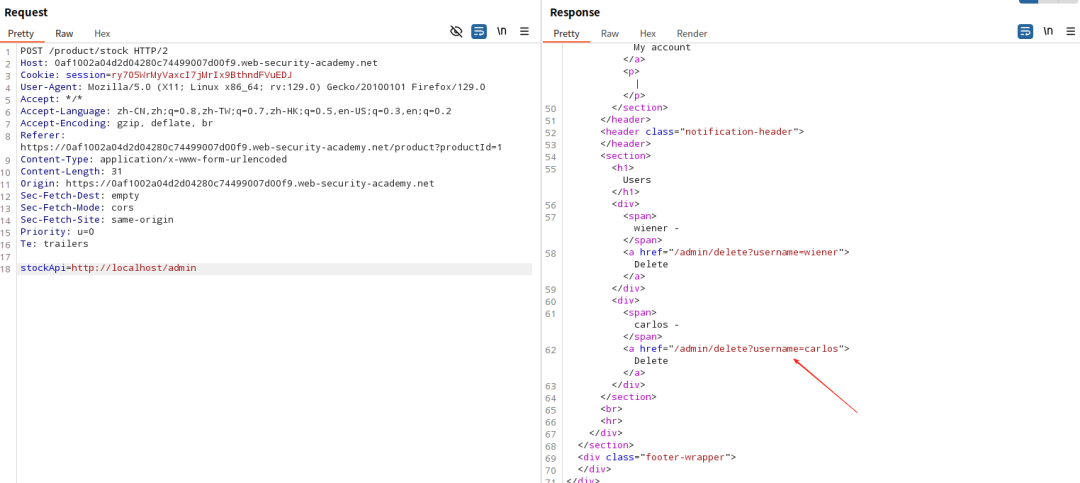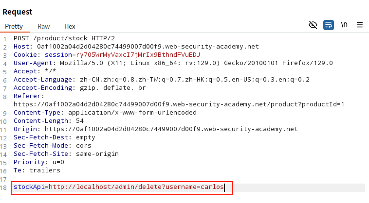 (4)把stockApi后的URL替换为http://localhost/admin/delete?username=carlos