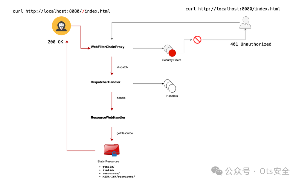 攻击者通过应用程序的路径如下:DispatcherHandler -> SimpleHandlerAdapter -> ResourceWebHandler -> PathResourceResolver -> Resource -> Attacker Access