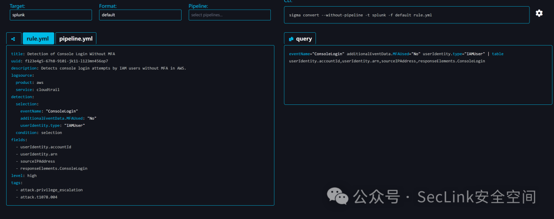推荐使用sigma-convert (https://github.com/marirs/sigma-convert),或者在线工具sigconverter (https://sigconverter.io/),将Sigma Rule转化为相应SIEM的搜索语句。例如: