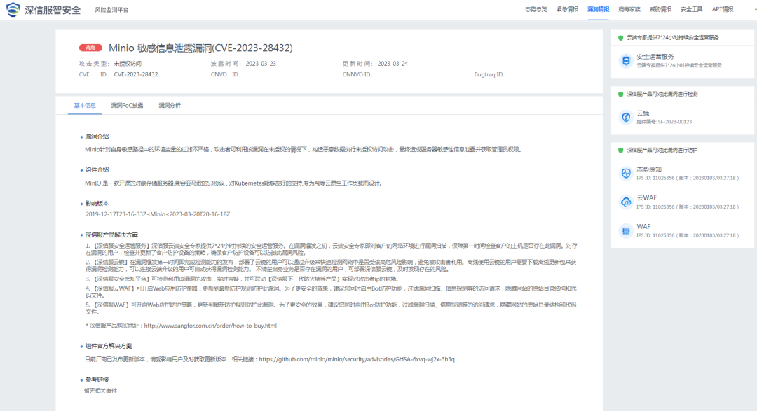 支持对Minio敏感文件泄露漏洞(CVE-2023-28432)的防御,可阻断攻击者针对该事件的入侵行为,相关产品及服务如下: