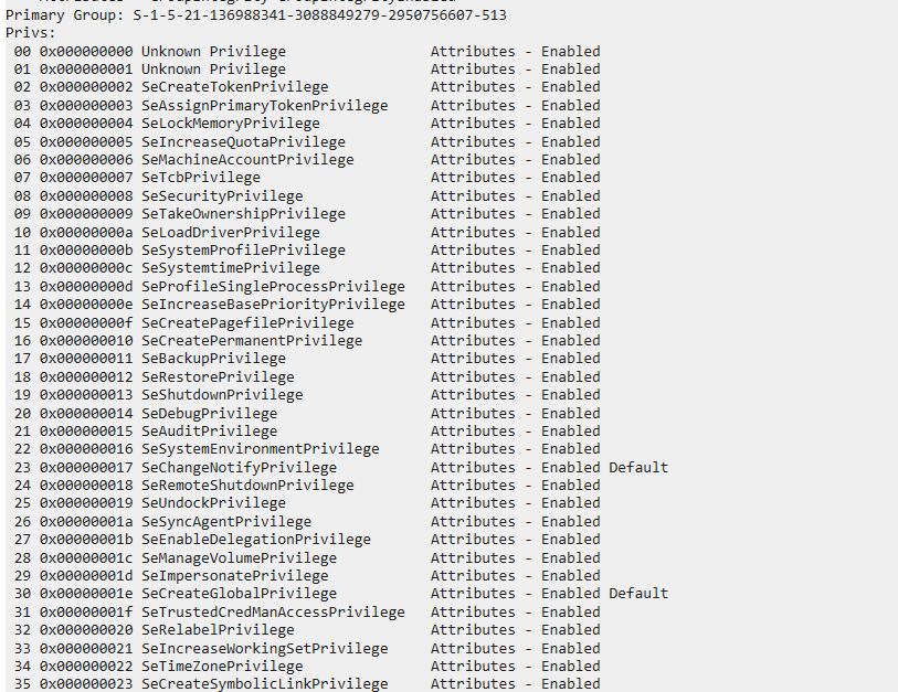 分别代表当前的主体可以选用的特权集合(Present)、已经打开的特权集合(Enabled)和默认打开的特权集合(EnabledByDefault),后两个集合应该是Present集合的子集。Windows运行过程中,实际上是检查了Enabled