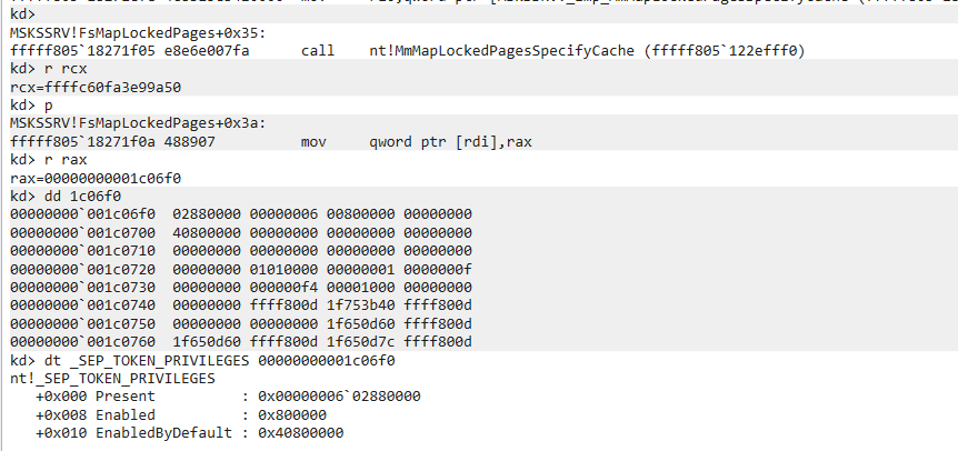 这里在调用完MmMapLockedPagesSpecifyCache函数后,返回了用户态的地址1c06f0,接下来就可以在这个地址上进行任意写,从而实现对Token Privileges的修改。