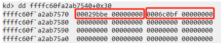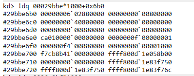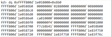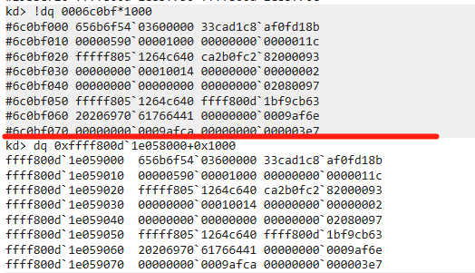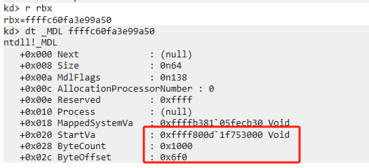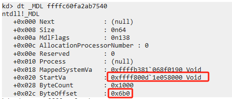 映射的虚拟地址为0xffff800d1e0586d0,因此 StartVa = 0xffff800d1e058000,ByteOffset = 0x6b0。而映射的长度为0x1000。接下来,将紧跟用于描述物理页地址的指针数组: