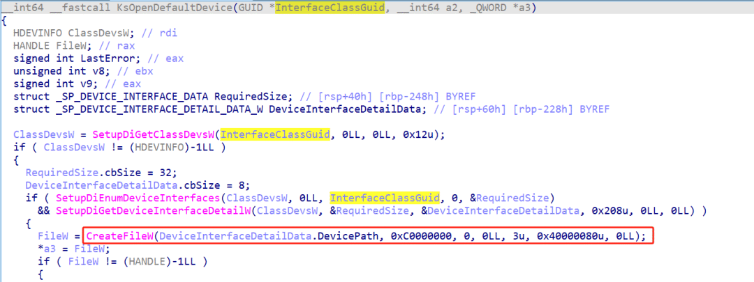 本质上KsOpenDefaultDevice内部也是调用了CreateFileW来获取句柄:
