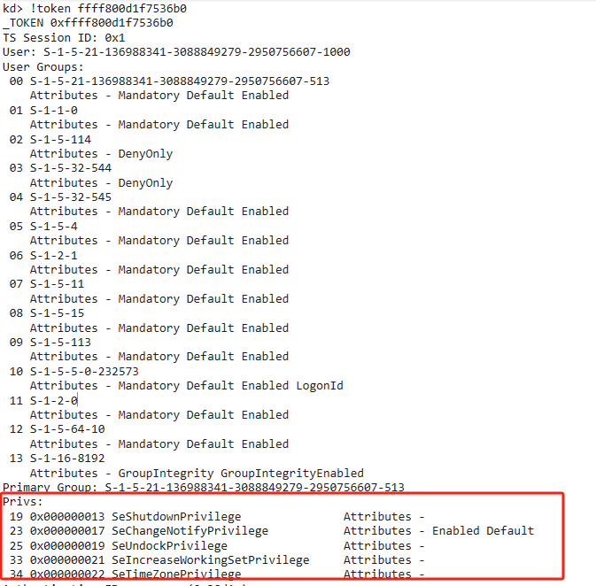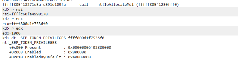 调用IoAllocateMdl时,使用Token Privileges的地址作为参数,可以看到此时权限较少。