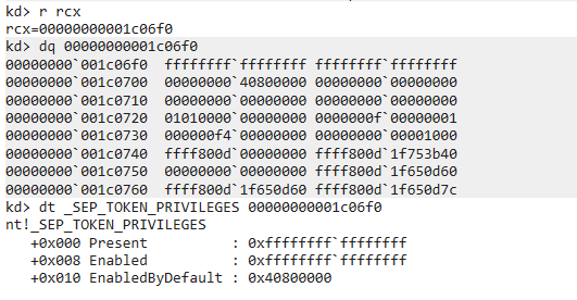 对于泄露出来的进程的Token地址,我们的目标是修改其偏移为0x40(_SEP_TOKEN_PRIVILEGES)处的内容。这是一个由3个8字节的位图组成的结构: