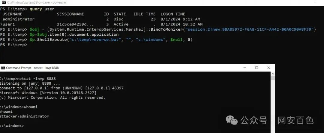 根据分析报告,攻击者通过利用COM跨会话激活,可以在提升的会话中创建一个ShellWindows对象,例如管理员会话。