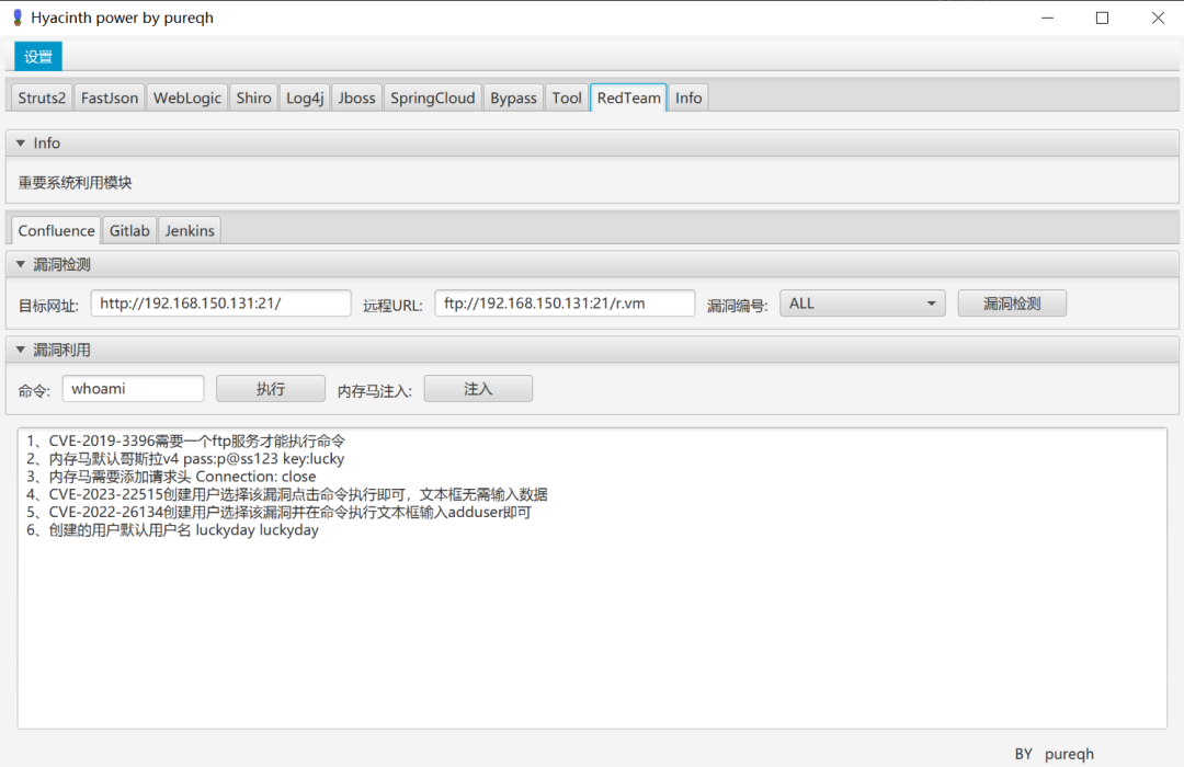 包含Struts2、Fastjson、Weblogic(xml)、Shiro、Log4j、Jboss、SpringCloud、等漏洞检测利用模块,及免杀webshell生成模块 Bypass、以及一些小工具模块等,由于图形化比较简明易懂,所以也不需要使用说明吧 。本项目的部分payload进行了一些混淆,具备一定过waf能力,有空会更新所有的payload。