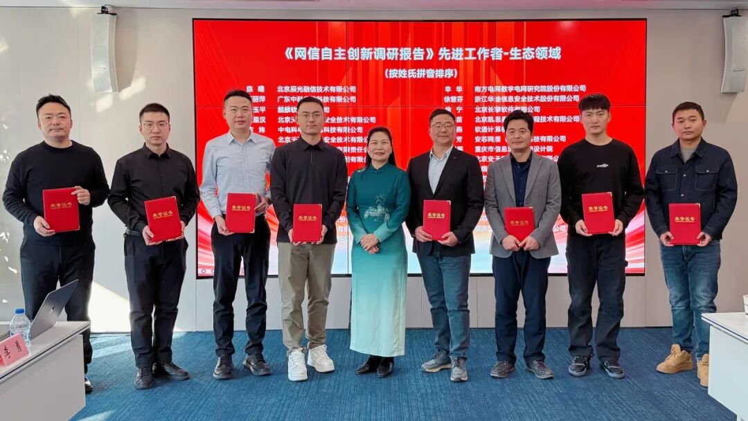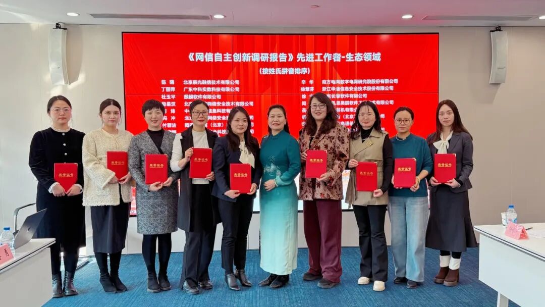 田霞主编在会议上表示,《2024网信自主创新调研报告》的统稿工作正在如火如荼的进行。今年的报告编写工作采用了全新的思路,将从全新的视角为读者呈现网信自主创新的成果,为进一步深化自主创新贡献力量。为了向在报告编写和发布过程中做出重要贡献的人员表示感谢,编委会从生态和技术两个维度评选了44名先进工作者(其中生态领域先进工作者31名,技术领域先进工作者13名)。田霞主编为先进工作者颁发了纪念证书。