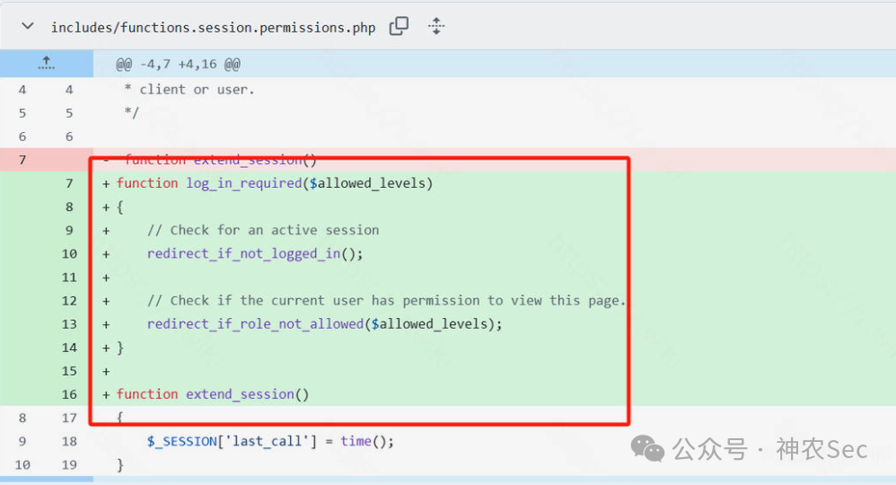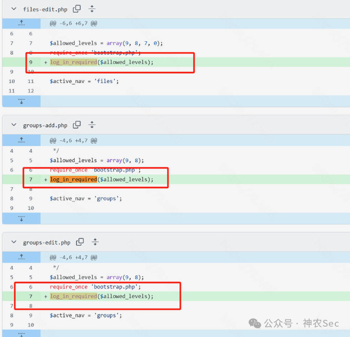 根据漏洞补丁可以看到该漏洞是由于在header.php文件中设置不同级别的授权,以限制给定用户允许的功能,授权检查可确保用户已登录并具有正确的权限级别。