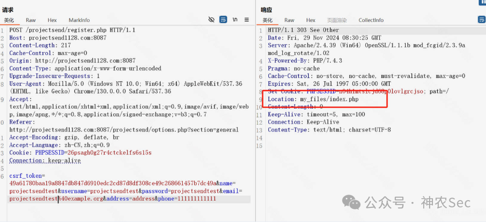 开启后就可以注册一个用户了,看回显示的话,请求头中有这个特征”Location: my_files/index.php”即为成功