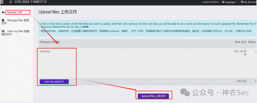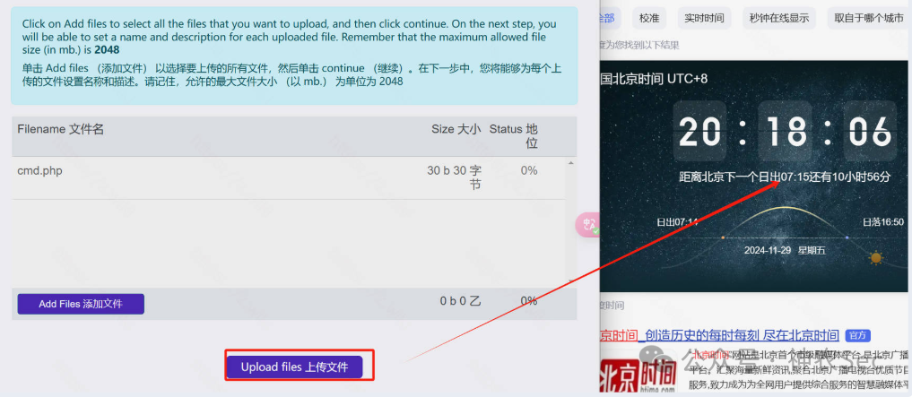 这里上传的时间为2024-11-29 20:21:51,文件名为cmd.php,sha1(projectsendtest)为197aaa8708c5ce35805cd8001c02430de03ba0d8