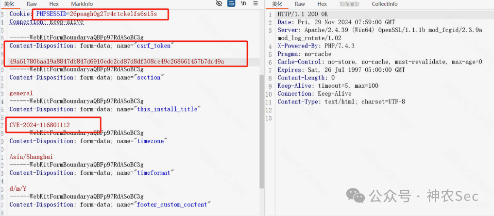 根据之前的漏洞分析我们可以得知,修改配置的代码其实是在权限验证之后的,所以我们使用一个正常未登陆的cookie的去测试能否修改配置文件,(csrf_token的值也要重新获取一遍)