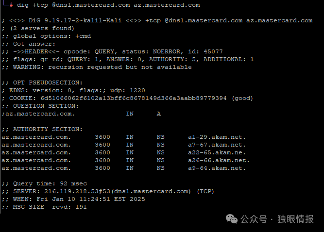 2025 年 1 月 14 日对域名 az.mastercard.com 进行 DNS 查找,显示错误输入的域名 a22-65.akam.ne