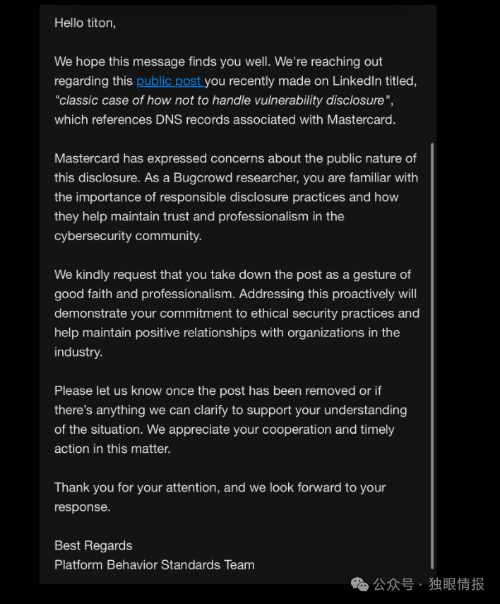 与此同时,Caturegli收到了Bugcrowd的一项请求。在LinkedIn上公开披露万事达DNS错误后,该平台认为他的行为不符合道德安全实践,并传达了万事达要求删除该帖子的请求。