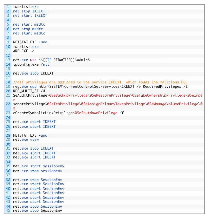 2023 年5月,遥测结果显示,在东亚的一个受影响组织中,有人执行了多个命令来启动和停止系统服务。攻击者滥用合法的Windows 服务MSDTC、IKEEXT和SessionEnv 来执行恶意DLL:oci.dll、wlbsctrl.dll和TSVIPSrv.dll。