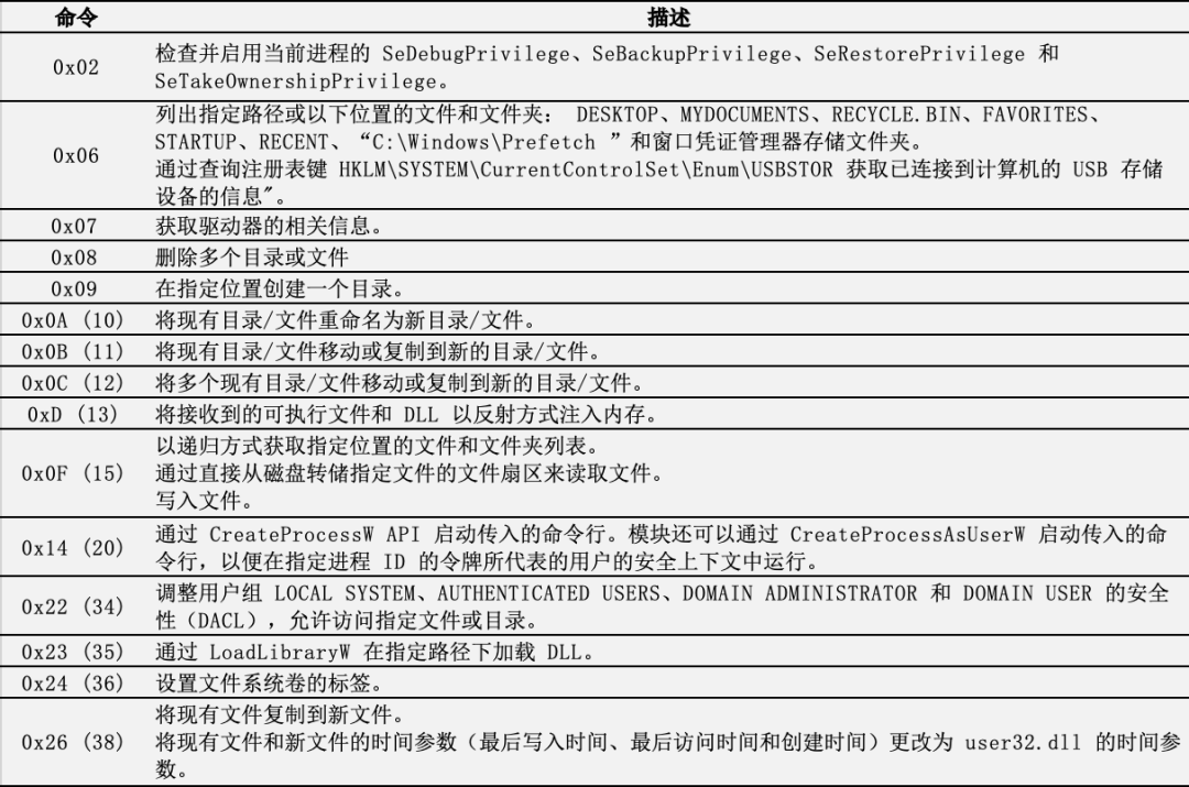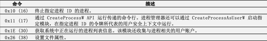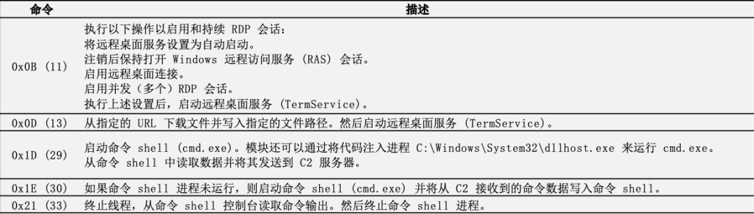 在最近对 EAGERBEE后门的调查中,发现中东地区的互联网服务提供商和政府机构正在部署该后门。相关的分析发现了这些攻击中使用的新组件,包括一个新颖的服务注入器,用于将后门注入运行中的服务。此外,还发现了在安装后门后部署的以前未记录的组件(插件)。这些插件支持一系列恶意活动,如部署附加有效载荷、探索文件系统、执行命令外壳等。主要插件可按其功能分为以下几组:插件编排器、文件系统操纵、远程访问管理器、进程探索、网络连接列表和服务管理。