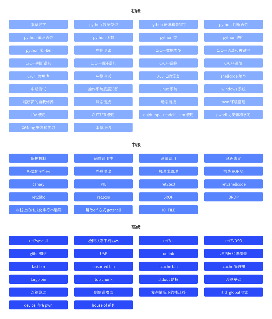 本课程分为入门-中级-进阶,共3大阶段,适合pwn各个阶层的学员。