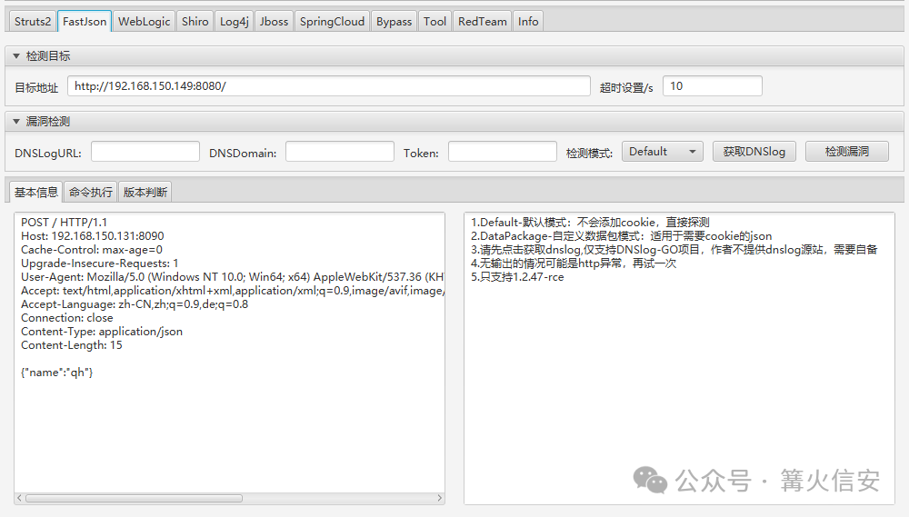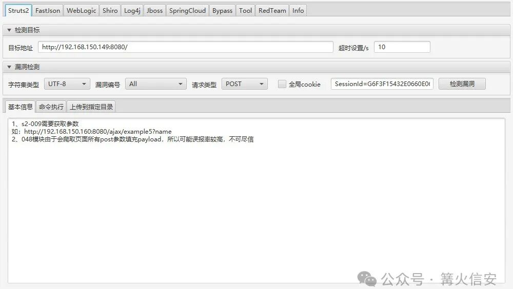 1、加载之后界面如下,最上一行切换不同的功能模块,包含常见漏洞Struct2,FastJson,WebLogin等,同时包含Bypass,小工具,以及重要系统利用模块。