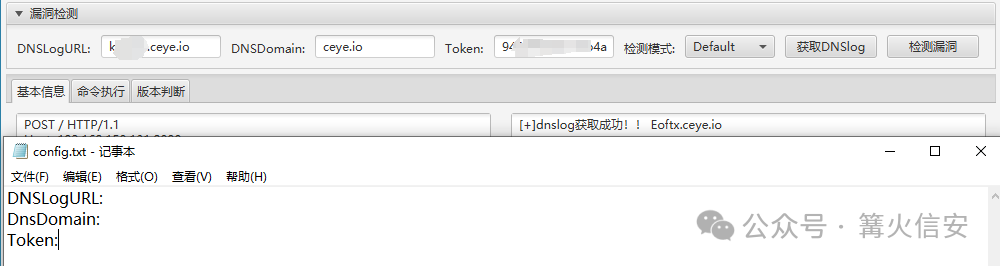 3、DNSlog有两种配置方式,一种是在当前目录创建config.txt手工配置,另一种是在需要用到dnslog的漏洞模块中直接填写配置。
