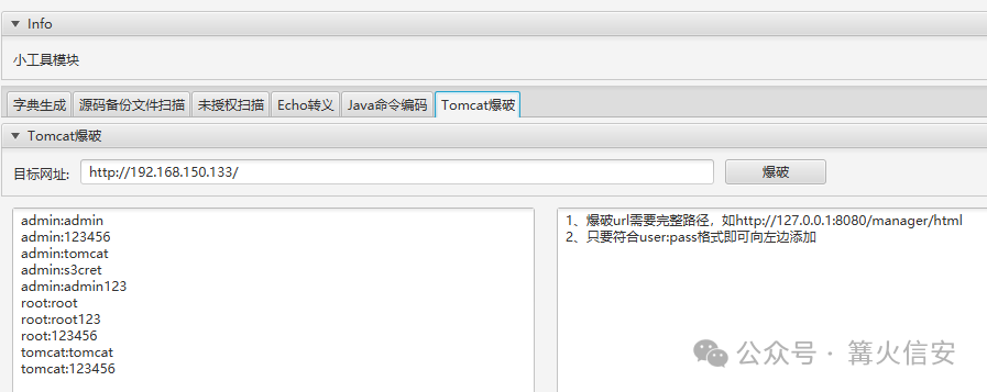 5、Tool模块包含字典生成、目录扫描、Tomcat爆破等等功能。