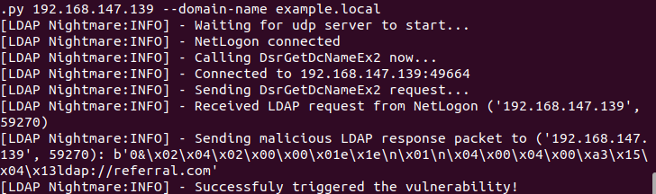 危害描述:攻击者通过向目标服务器发送恶意RPC请求诱骗目标服务器向攻击者发送LDAP查询,从而导致信息泄露和服务器崩溃等危害。 |