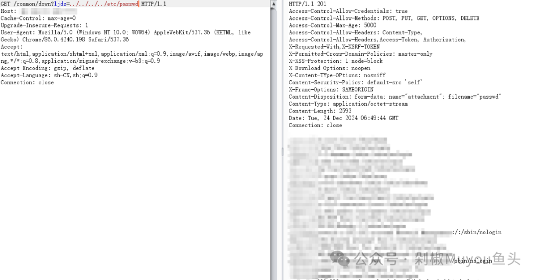 对当前接口进行测试,成功下载/etc/passwd文件,发现当前接口存在任意文件读取漏洞。