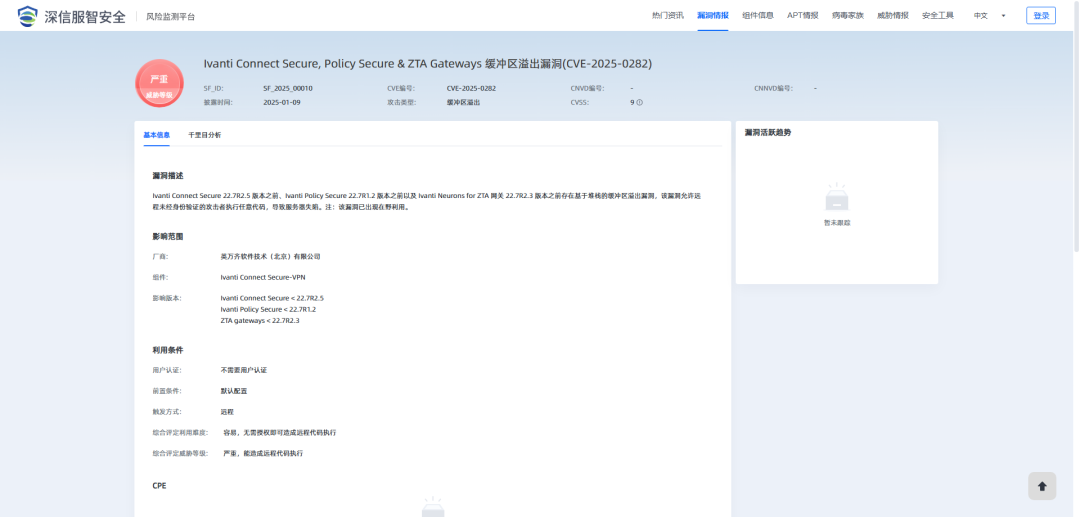 2025年1月9日,深瞳漏洞实验室监测到一则Ivanti Connect Secure, Policy Secure & ZTA Gateways组件存在缓冲区溢出漏洞的信息,漏洞编号:CVE-2025-0282,漏洞威胁等级:严重。