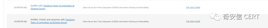 以下漏洞由奇安信天工实验室安全研究员发现并提交,包括:CVE-2023-23394 客户端服务器运行时子系统 (CSRSS) 信息泄露漏洞、CVE-2023-23409 客户端服务器运行时子系统 (CSRSS) 信息泄露漏洞。