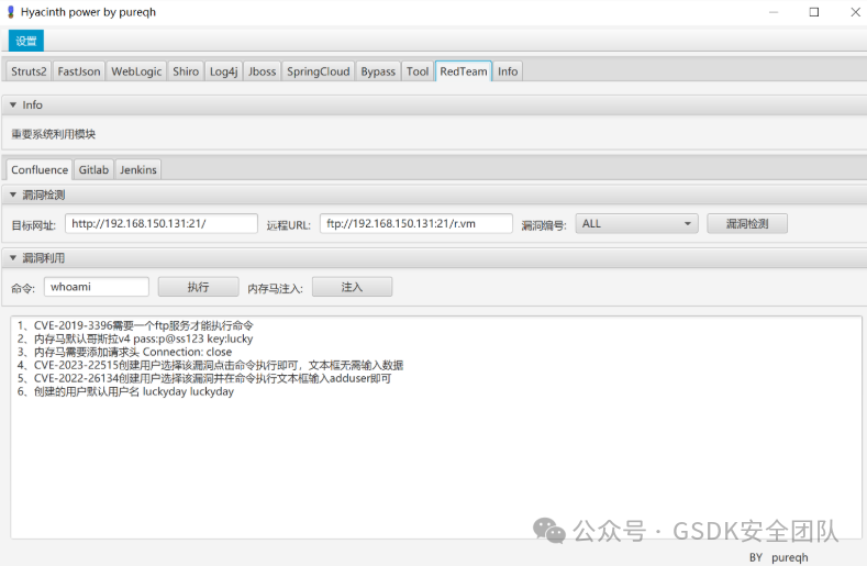 一款java漏洞集合工具。之前攻防的时候,总是需要打开多个jar包,觉得很麻烦,就做了一款集合工具。其中包含Struts2、Fastjson、Weblogic(xml)、Shiro、Log4j、Jboss、SpringCloud、等漏洞检测利用模块,及免杀webshell生成模块 Bypass、以及一些小工具模块等。本项目的部分payload进行了一些混淆,具备一定过waf能力,有空会更新所有的payload。