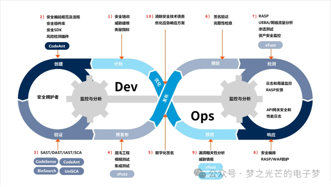 从下面SDL和DevSecOps这两幅图我们能看到,安全在力争渗透到开发流程的各个阶段。从需求设计、到开发测试,再到上线运营,哪个阶段都少不了。每个阶段耽误业务一点点,整体加一起耽误的时间就长了。业务就像戴着一副枷锁在干活,慢慢吞吞、束手束脚。他们眼中的安全就是指手画脚、凸显存在、没事找事、哪有事哪到。在这种情况下,安全与业务之间没有矛盾就怪了。