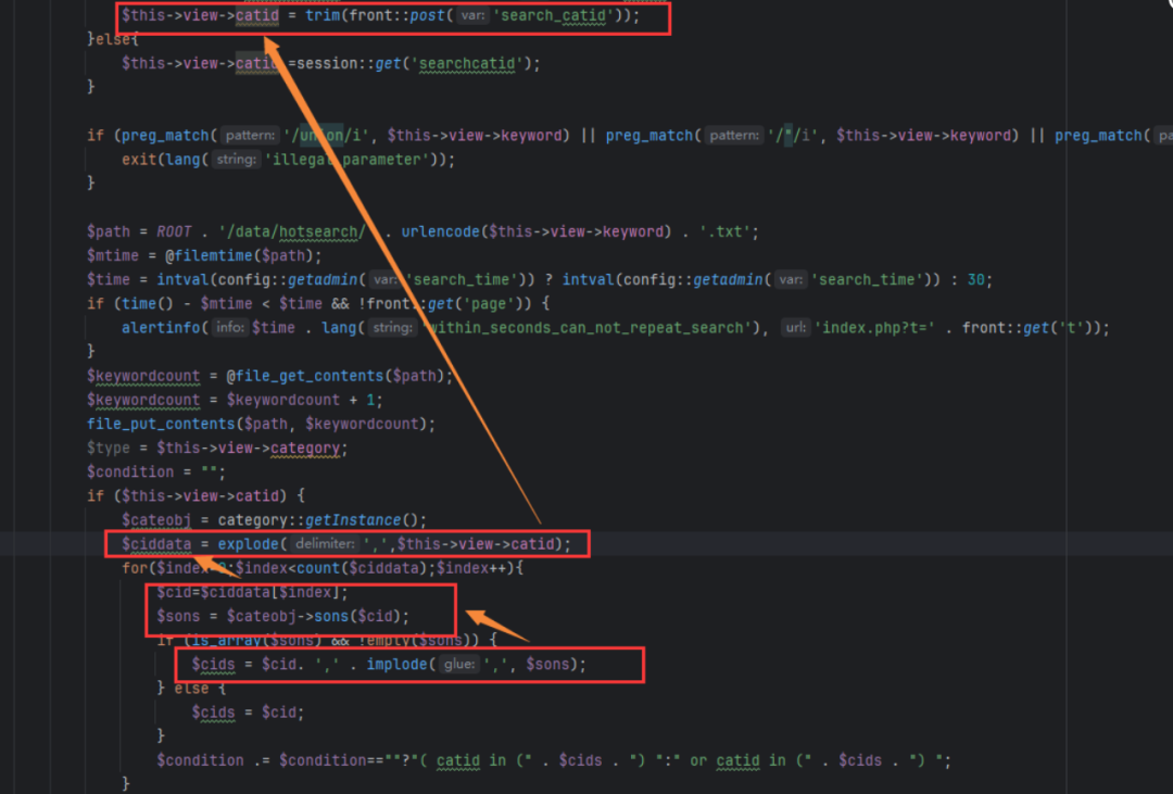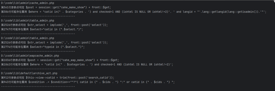 通过分析漏洞的实现,实际上就是先用正则匹配相关语句,然后向上溯源参数在赋值和传递的过程中是否可以抵达可控点,如果未数字型的sql注入,还需要排除变量或参数被intval()