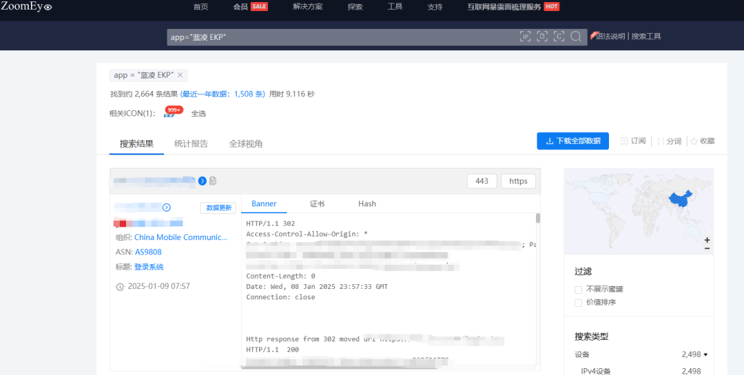根据ZoomEye网络空间搜索引擎关键字 app=”蓝凌 EKP” 对潜在可能目标进行搜索,共得到2664条IP历史记录。主要分布在中国、美国等国家。(ZoomEye搜索链接: