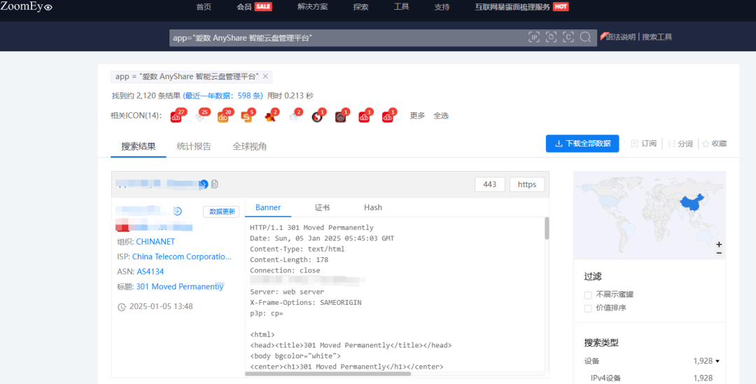 根据ZoomEye网络空间搜索引擎关键字 app=”爱数 AnyShare 智能云盘管理平台” 对潜在可能目标进行搜索,共得到2120条IP历史记录。主要分布在中国、美国等国家。(ZoomEye搜索链接: