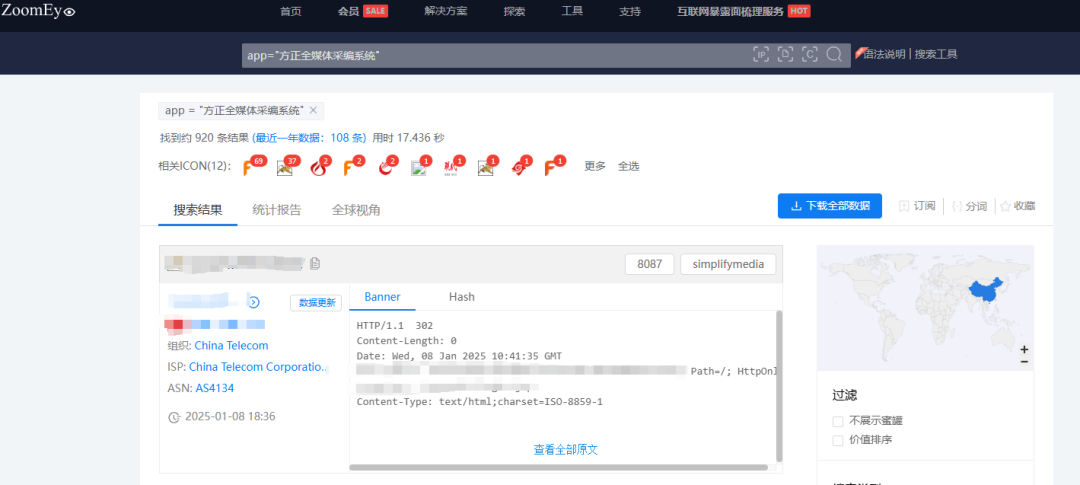 根据ZoomEye网络空间搜索引擎关键字 app=”方正全媒体采编系统” 对潜在可能目标进行搜索,共得到920条IP历史记录。主要分布在中国、马来西亚。(ZoomEye搜索链接: