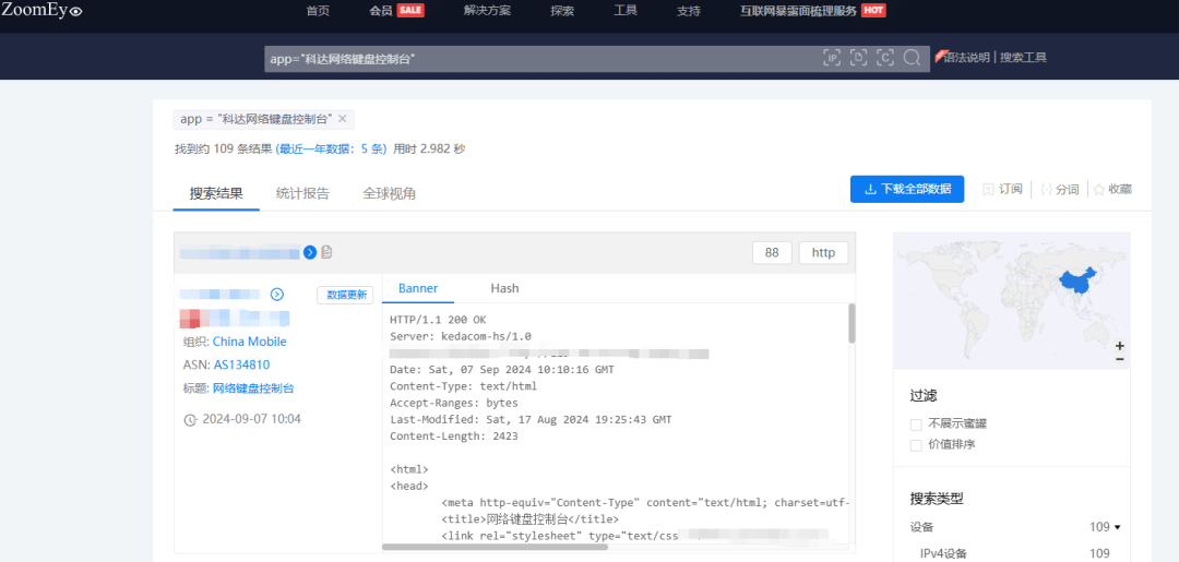 根据ZoomEye网络空间搜索引擎关键字 app=”科达网络键盘控制台” 对潜在可能目标进行搜索,共得到109条IP历史记录。主要分布在中国、埃塞俄比亚等国家。(ZoomEye搜索链接: