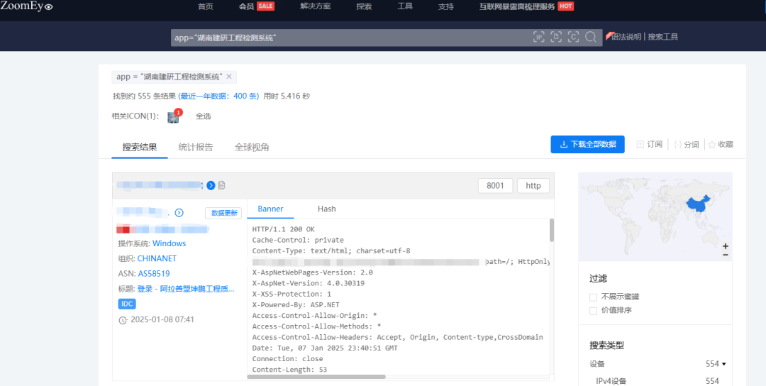 根据ZoomEye网络空间搜索引擎关键字 app=”湖南建研工程检测系统” 对潜在可能目标进行搜索,共得到555条IP历史记录。主要分布在中国湖南、广西等地。(ZoomEye搜索链接: