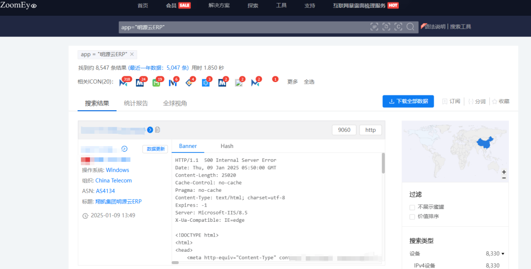 根据ZoomEye网络空间搜索引擎关键字 app=”明源云ERP” 对潜在可能目标进行搜索,共得到8547条IP历史记录。主要分布在中国、新加坡等国家。(ZoomEye搜索链接: