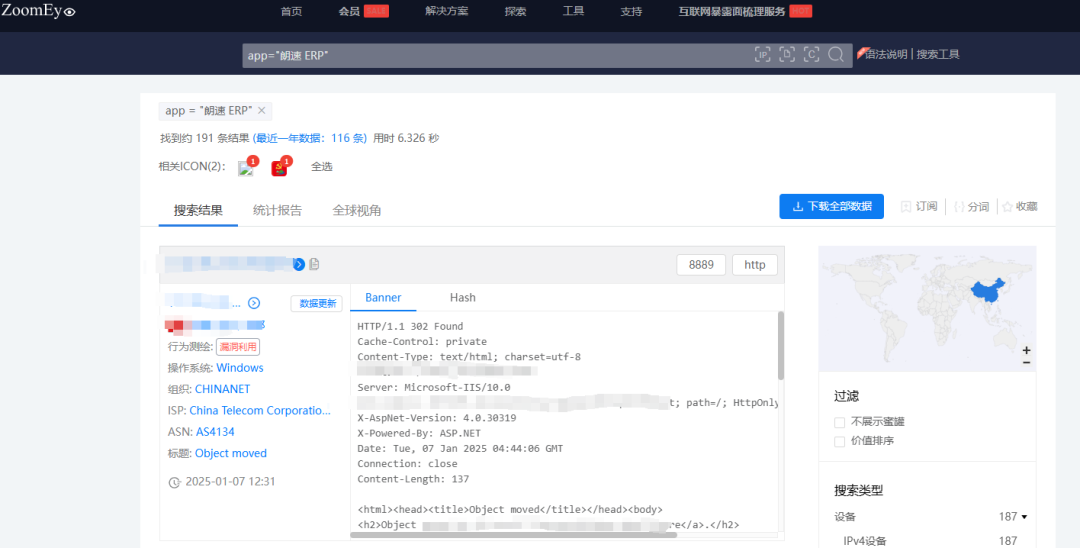 根据ZoomEye网络空间搜索引擎关键字 app=”朗速 ERP” 对潜在可能目标进行搜索,共得到191条IP历史记录。主要分布在中国四川、广东等地。(ZoomEye搜索链接: