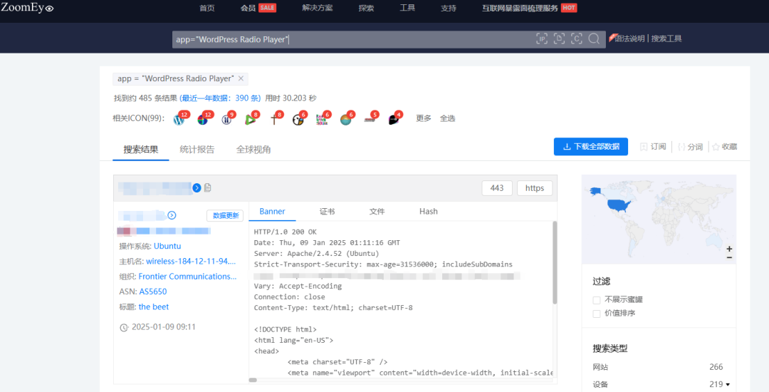 根据ZoomEye网络空间搜索引擎关键字 app=”WordPress Radio Player” 对潜在可能目标进行搜索,共得到485条IP历史记录。主要分布在美国、德国等国家。(ZoomEye搜索链接: