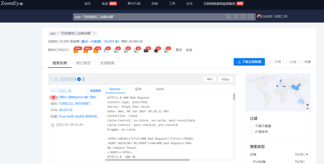 根据ZoomEye网络空间搜索引擎关键字 app=”四信通信工业路由器” 对潜在可能目标进行搜索,共得到76989条IP历史记录。主要分布在西班牙、瑞典等国家。(ZoomEye搜索链接: