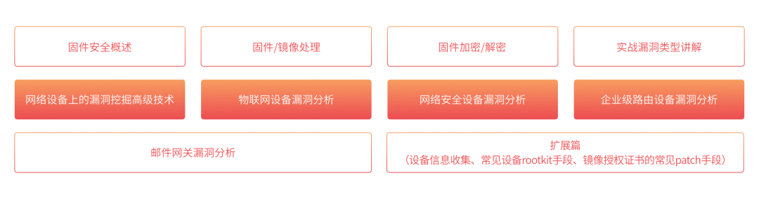 课程内容涵盖了固件安全基础、固件/镜像获取与处理、固件加密/解密、固件仿真与调试、漏洞挖掘与分析等多个方面。通过对各类嵌入式设备、网络设备、边界安全设备等的漏洞挖掘基础、方法、技巧和思路的全方位介绍,课程帮助学员掌握企业级网络设备的逆向分析方法,提升个人竞争力。