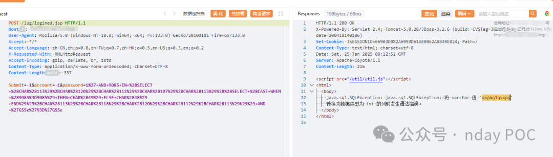 博斯外贸管理软件V6.0 log/logined.jsp 接口存在SQL注入漏洞,未经身份验证的远程攻击者除了可以利用 SQL 注入漏洞获取数据库中的信息(例如,管理员后台密码、站点的用户个人信息)之外,甚至在高权限的情况可向服务器中写入木马,进一步获取服务器系统权限。