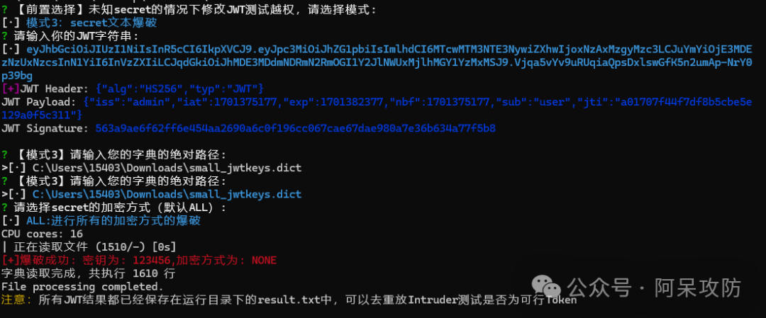 注意:所有JWT结果都已经保存在运行目录下的result.txt中,可以去重放Intruder测试是否为可行Token