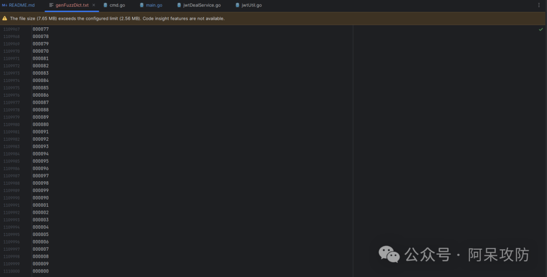 这里会在当前目录下生成genFuzzDict.txt,因为生成的量会很大,本来使用线程池+生产消费者模式去处理的,但是实际运行后在4位开始就会由于内存不足导致程序崩溃,于是改进为文本保存读取方式,在程序匹配到密钥的时候就会自行退出不再读取文件。