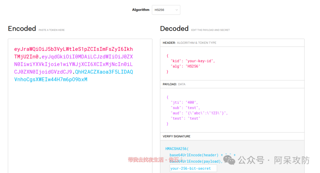 eyJraWQiOiJ5b3VyLWtleS1pZCIsImFsZyI6IkhTMjU2In0.eyJqdGkiOiI0MDAiLCJzdWIiOiJ0ZXN0IiwiYXVkIjoie1wiYWJjXCI6XCIxMjNcIn0iLCJ0ZXN0IjoidGVzdCJ9.QhH2ACZXaoa3F5LIDAQVnhoCgsXWEIw44H7m6pO9bxM