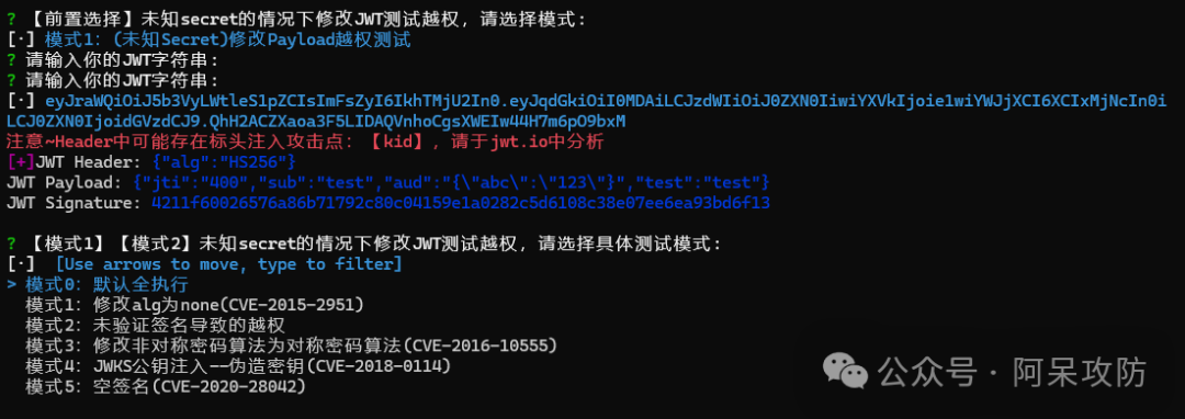 选择模式:0为默认全执行,1为修改alg为none(CVE-2015-2951),2为未验证签名导致的越权,3修改非对称密码算法为对称密码算法(CVE-2016-10555) 4为JWKS公钥注入--伪造密钥(CVE-2018-0114) 5 为空签名(CVE-2020-28042)