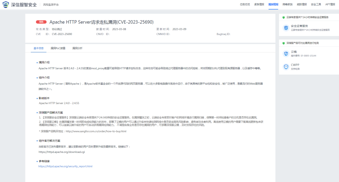 2023 年 3 月 9 日,深信服安全团队监测到一则 Apache HTTP Server 组件存在请求走私漏洞的信息,漏洞编号:CVE-2023-25690,漏洞威胁等级:高危。